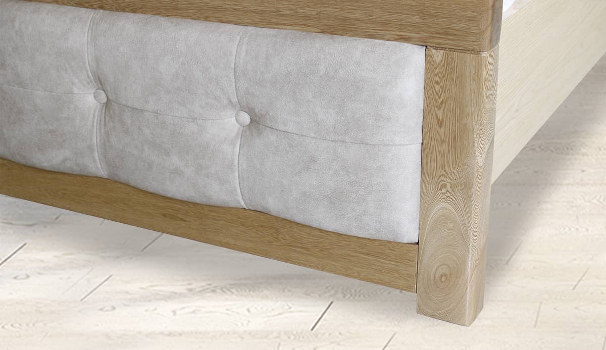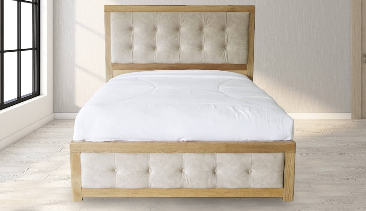 La cama Oikos Natural cuenta con un elegante diseño capitoneado, lo que le da un aspecto moderno y sofisticado. La madera natural aporta un toque cálido y acogedor al ambiente y la combinación de materiales y texturas agrega un estilo único a cualquier habitación.