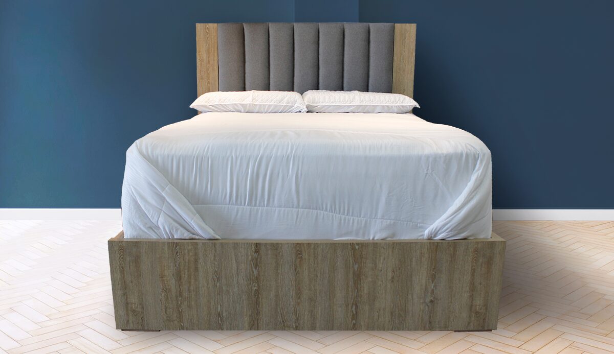 Nuestra elegante cama Sakai esta diseñada para combinar estilo y funcionalidad. Con un diseño rectangular y líneas limpias, esta cama se adapta perfectamente a cualquier estilo de decoración. El cabecero destaca con un panel tapizado de líneas verticales acolchadas, proporcionando un toque de confort y sofisticación. Adicionalmente su marco hecho de melamina en tono madera clara, crea una elegante forma que enmarca el tapizado, mostrando un contraste visualmente atractivo. Esta cama es la elección perfecta para quienes buscan elegancia y comodidad en su dormitorio.