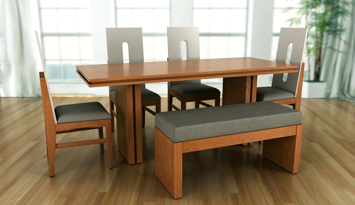 Comedor de nueva colección caracterizado por su belleza superficial, donde se puede apreciar claramente las líneas estilizadas propias de la Madera de Roble Flor Morado, su tonalidad color miel es ideal para matizar con decoraciones modernas y su diseño de líneas limpias crean un ambiente realmente sofisticado.