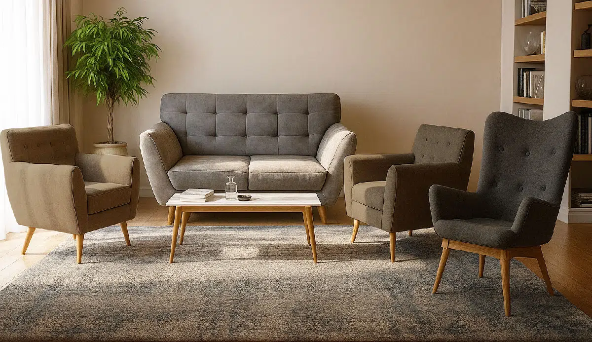 Sofá Acentto 2P + 2 Sillas Oikos + 1 Silla Cassoni + Mesa Oikos